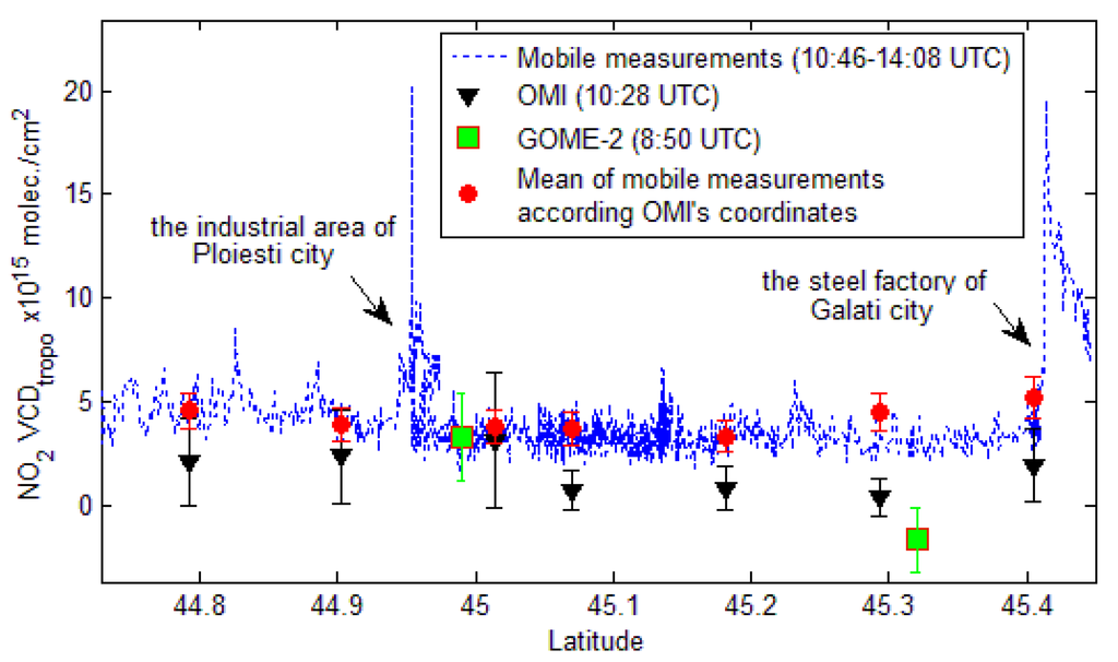 Figure 11 shows the tropospheric NO2 VCD derived from zenith-sky measurements corresponding to OMI and GOME-2 satellite observations, as a function of latitude. The first NO2 peak of mobile measurements was recorded close to a power plant around Ploiesti city and the second one was recorded around a steel and iron factory which is close to the Galati city. Between these cities no other strong source for NO2 emissions exists along the trajectory of the mobile measurements. The NO2 background for mobile measurements is estimated at about (3.5 ± 0.6) × 1015 molec./cm2. The satellite instruments generally underestimate NO2 content, especially in less polluted areas. However, the difference between satellite and mobile observations are reduced in areas where strong NO2 sources are encountered.