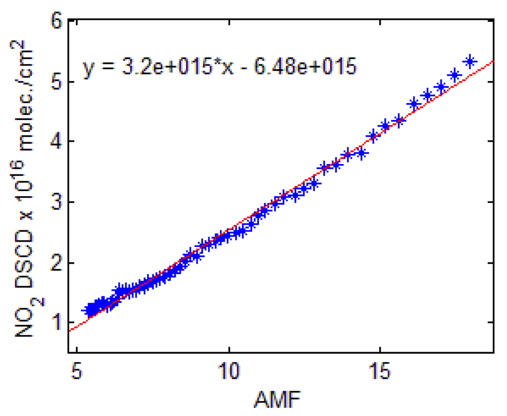 The error on the estimation of the slant column in the reference spectra (SCDref), which was obtained using a Langley plots (σSCDref), depends on the one hand on the NO2 variation during twilight and on the other hand on the correct selection of the SZA interval for the AMF calculation used in the Langley plots. In our case, the error on the SCDref was calculated using the standard error formula for the case of simple linear regression.