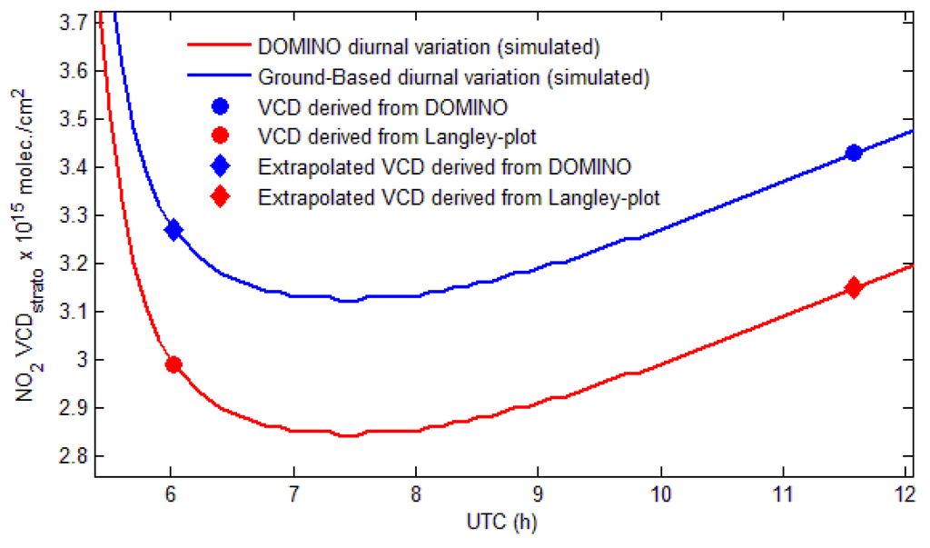 Figure 4 compares the stratospheric VCD derived from the photo-chemically modified Langley-plot and from OMI. The diurnal variation of VCDstrato was calculated by extrapolating data from OMI measurements to the simulation of the PSCBOX model. Stratospheric NO2 columns from the DOMINO retrieval exceed the ground-based measurements by no more than 0.3 × 1015 molec./cm2. In a recent study [44], where DOMINO was compared with the SAOZ (Système d'Analyse par Observations Zénithal) instruments and the Network for the Detection of Atmospheric Composition Change (NDACC), a similar level of agreement was found.
