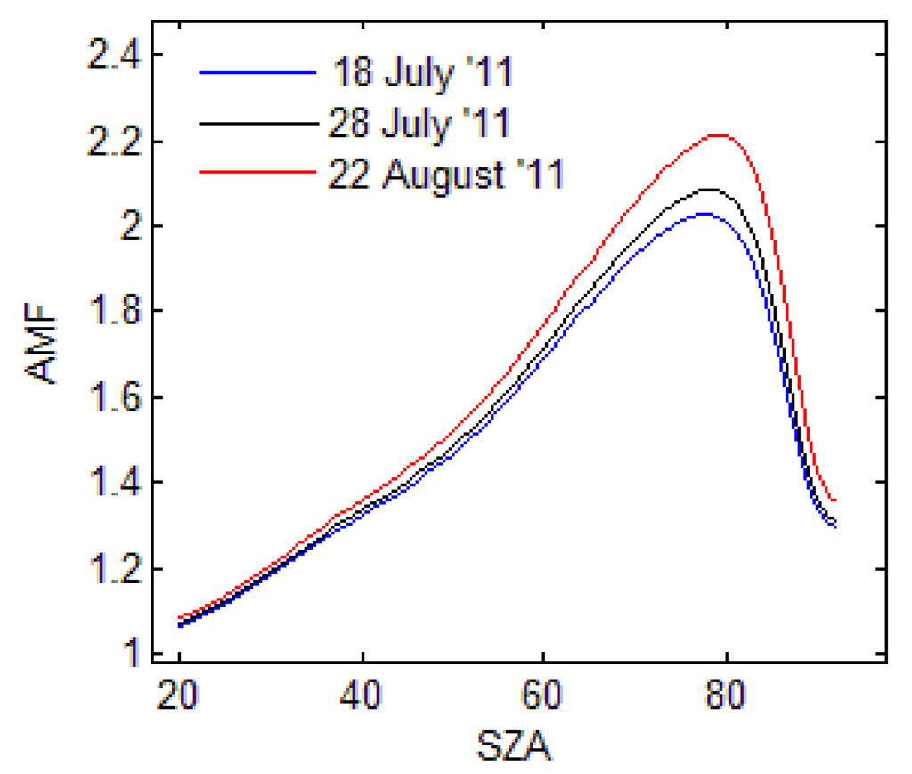 The AMFs simulations presented in this study were performed using the radiative transfer model (RTM) UVspec/DISORT. The RTM is based on the discrete ordinate method and deals with multiple scattering in a pseudo-spherical approximation. Given the wavelength, the observation's geometry relative to the Sun and the atmospheric state, the model calculates the scattered radiance and the absolute SCD of molecular absorbers. For the tropospheric AMF simulations we used NO2 profiles representative of Romania obtained from the CHIMERE model. The AMFtropo simulations were made by setting a grid of 10 km altitude and the wavelength for NO2 simulation at 440 nm. Figure 5 shows the results of tropospheric AMFs simulations for the three days with road measurements in 2011.