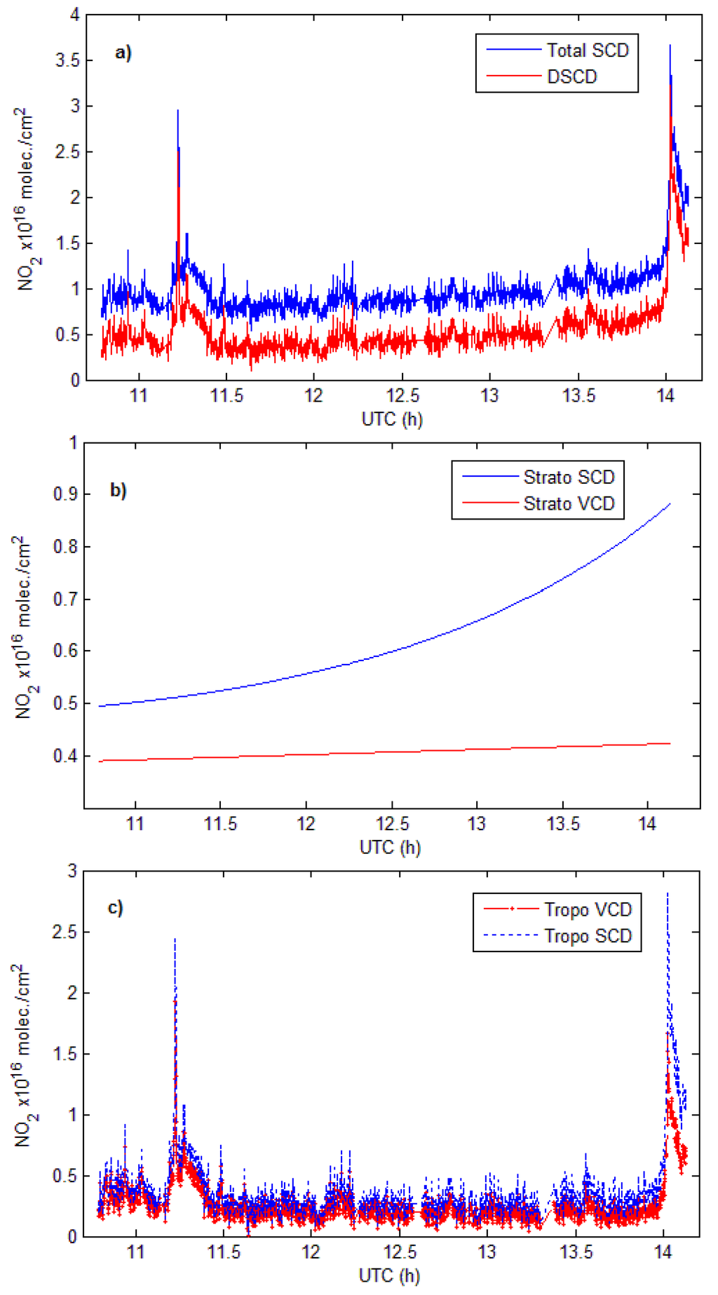 Figure 6 presents the spatial variation of tropospheric NO2 VCDs and the corresponding NO2 slant columns measured on 22 August 2011. The comparison of the DSCD with the VCDtropo gives similar values around noon, which can be explained by the quasi vertical light path of solar photons through the atmosphere when the sun is high. Also this might indicate that a noon reference spectrum with a low NO2 content can correct for stratospheric slant column [42]. After noon, the DSCD increasingly and linearly deviates from the VCDtropo at a rate of approximately 1% per degree of SZA. This is due the diurnal variation of stratospheric NO2.