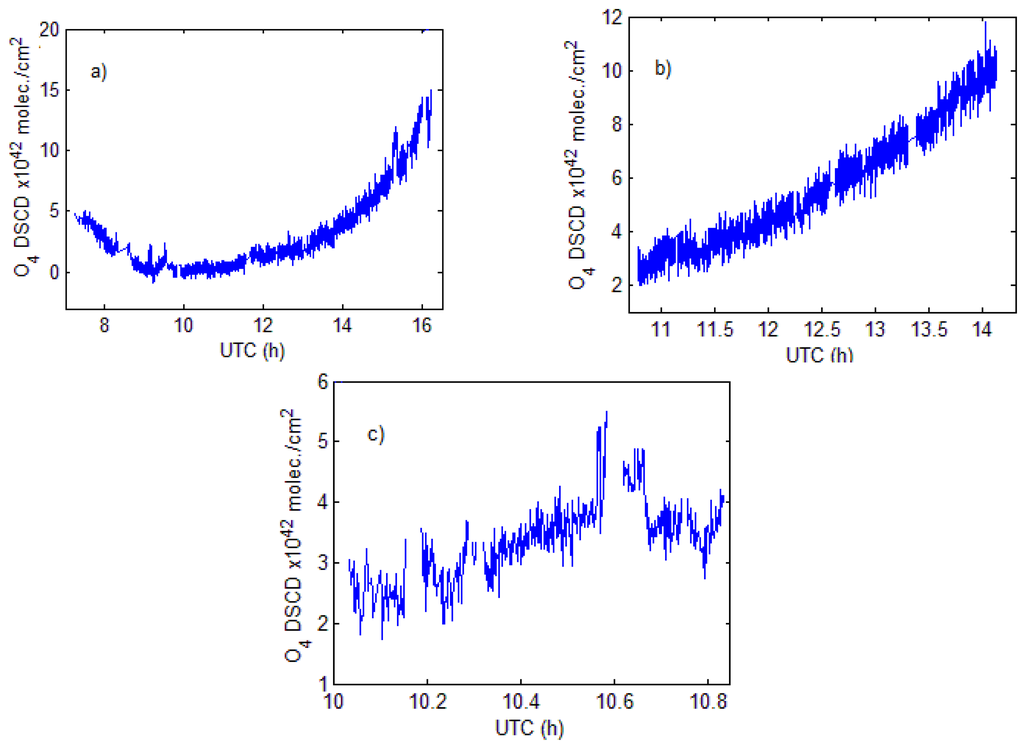As an additional selection criterion, O4 absorption measurements performed together with NO2 were used as an indicator for the variation of the radiative transport through the atmosphere [47]. In a clear sky atmosphere, the oxygen collisional dimer O4 absorption varies with the square of the oxygen pressure [48] and is weakly dependent on temperature [49]. Analyzing the O4 DSCDs resulting from the DOAS fit (Figure 7) the time variations of O4 can therefore give an idea of the light path enhancement through the atmosphere.