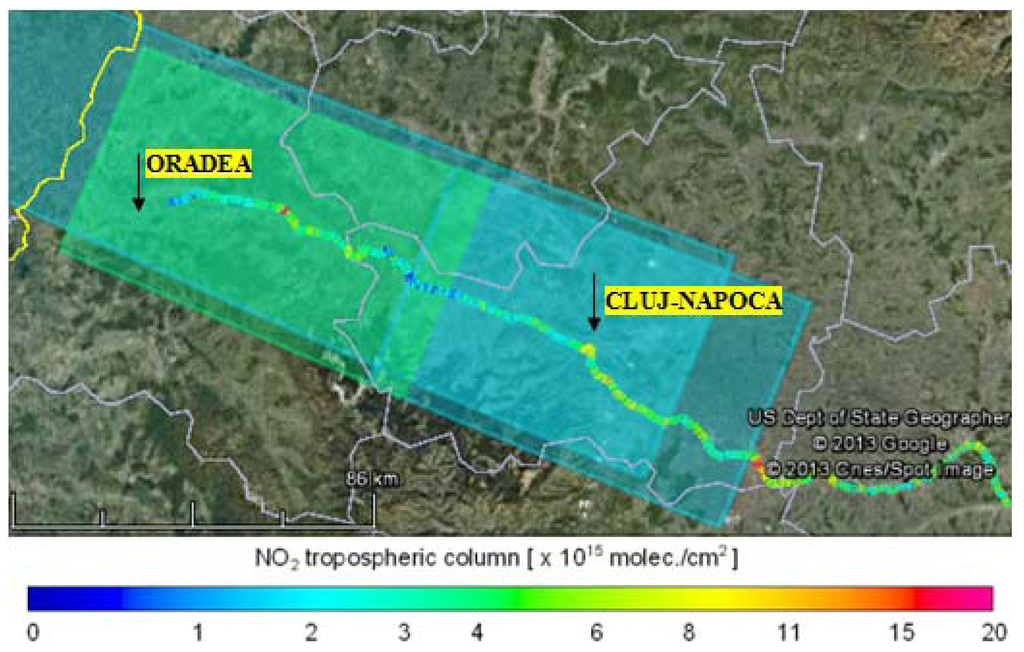 After averaging the tropospheric NO2 columns along the spatial extent of the satellite pixel, for a location centered on 47.03°N, 22.45°E which is influenced by emissions of two important cities, Oradea (47.05°N, 21.94°E) and Cluj-Napoca (46.76°N, 23.60°E), the NO2 loadings were found to be similar. For this location the averaged mobile measurements amount to (3.4 ± 0.7) × 1015 molec./cm2 while GOME-2 observations indicate (3.4 ± 1.9) × 1015 molec./cm2. Figure 9 shows that satellite measurements in the pixels located at 22.2 and 23.4 longitude are significantly smaller than mobile measurements. The satellite cannot “see” NO2 emissions from very small areas (e.g., NO2 located around to the road with low traffic, small cities or villages) while mobile measurements can determine the NO2 at a very small resolution comparing to GOME-2 observations (40 × 80 km2). The area of measurements is generally “clean” of NO2 being covered mostly by forested mountains. We believe that an increased number of measurements inside the GOME-2 pixels, away from point sources of NO2, would reduce discrepancies after averaging the mobile measurements according to the size of the satellite pixel.