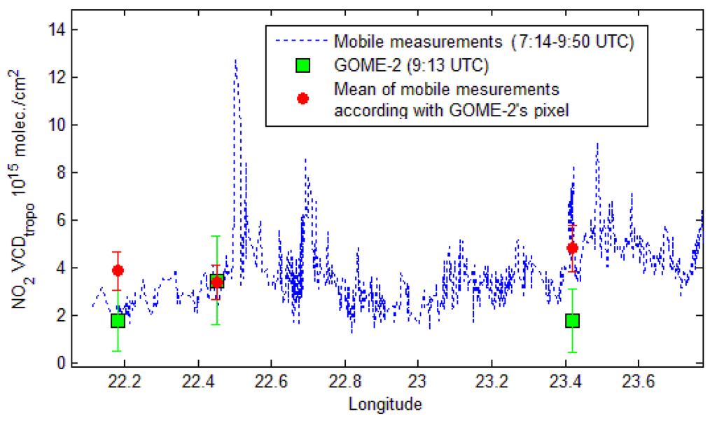 The next figure presents measurements of GOME-2, with a horizontal resolution of 40 × 80 km2, mobile observations and the average of mobile observations according to pixel size of GOME-2. Satellite observations and averages of mobile measurements are accompanied by error bars. The background NO2 satellite loading was considered to be the minimum observed by satellite, which is (1.8 ± 1.3) × 1015 molec/cm2.