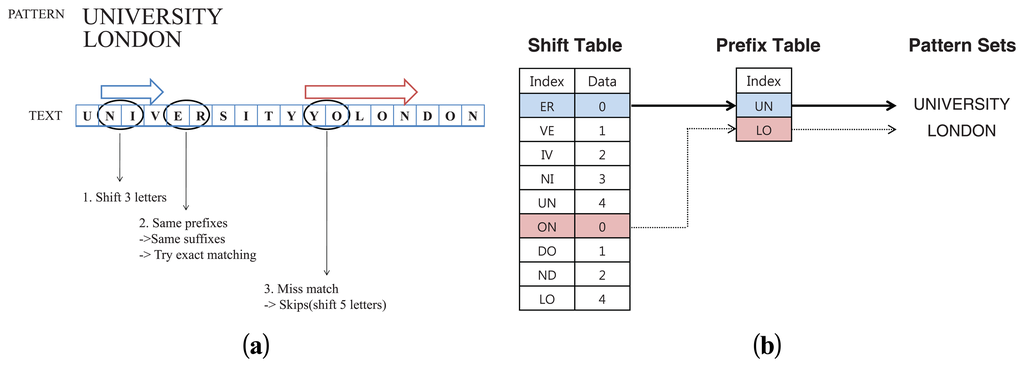 Figure 1(a) shows a simple example for finding patterns using the WM algorithm. Let us first assume that there are only two patterns to search: “UNIVERSITY” and “LONDON”. The WM algorithm first constructs the shift and hash tables from the patterns before it starts the actual matching operation. Because the shortest pattern “LONDON” has six characters, the minimum length m is set as 6. To make an appropriate shift table among m characters, the pattern “UNIVERSITY” is also considered as the first six letters “UNIVER.” Assuming that the block size B is 2, we can make the shift table based on the two patterns. For example, the subsets “ER” and “ON” are zero-shifting entries and “VE” and “DO” indicate the shift value as 1. The pointer of the text string is continuously shifted by the entries of the shift table until the pointer reaches the end of the text string.