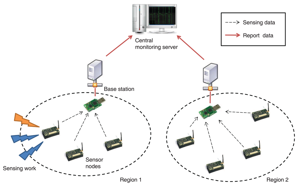 Figure 2 shows an example of the system model based on the multiple networked sensors. Each node is assigned to certain regions and gathers external sensing information for predefined purposes. For a certain time period, the nodes have transmitted the data to the assigned base station for summarization of the sensing works. Meanwhile, the base station of a particular region is responsible for collecting data and managing sensors in the same region. The packet from each base station to a top monitoring server represents the summarized sensing data of their own regions. Because of this cluster-based structure, the general analysis at the top monitoring server is simplified by these base stations.