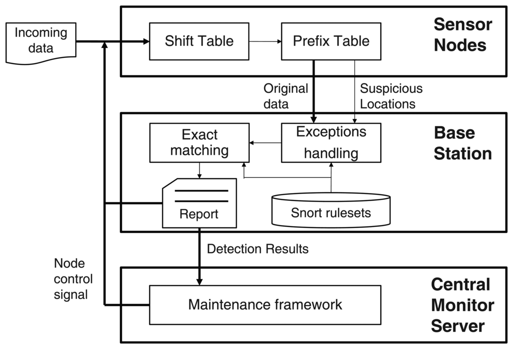 Snort is one of the well-known IDSs based on a hybrid algorithm that uses both misuse detection and anomaly-based inspection [19]. Snort has rule sets that define malicious attacks. Each rule contains information about a protocol, port number, and context of the packet. The rule sets support regular expressions that contain wild-card characters, and the sets require the algorithm to perform both signature and heuristic matching. Many researchers have conducted studies to accelerate and optimize the rule set finding mechanisms such as pattern-matching algorithms [9,20,21]. However, these efforts are still difficult to implement in sensor networks because the schemes should be modified for the constrained resources of the sensor node.