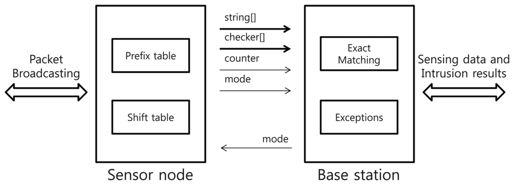 In this section, we introduce an NIDS framework modified for small-sized sensor nodes. This section first introduces the computation offloading method from a resource-constrained sensor node to a resource-rich base station. This section also describes MinWM (Minimized Wu–Manber algorithm) optimized for each device. MinWM uses a process dividing scheme and makes two nodes to manage the shift table and prefix table independently. Packet transmission management among the network is also discussed briefly where sensor nodes determine whether a packet is a malicious attack or not.