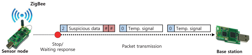 Simple attack emulations are conducted on the sensor nodes as shown in Figure 6. A target node periodically sends the current temperature to the base station; the time interval is set as one second in this evaluation, but it can be changed. We artificially generate attack signals that contain DDoS signatures and insert them into the sensor node through wireless networks. A sensor node that receives these signatures can detect them and make an alert signal. In the figure, only a certain part of payload in the alert signal is presented: counter, suspicious data, and checker referred in Figure 4. After the alert signal is sent to the base station, the node stops sensing the current temperature and waits for response from the base station. The base station verifies the suspicious data on the alert signal and then reports the result by sending the response signal. Under this emulation environment, we evaluate performance of the proposed approach.