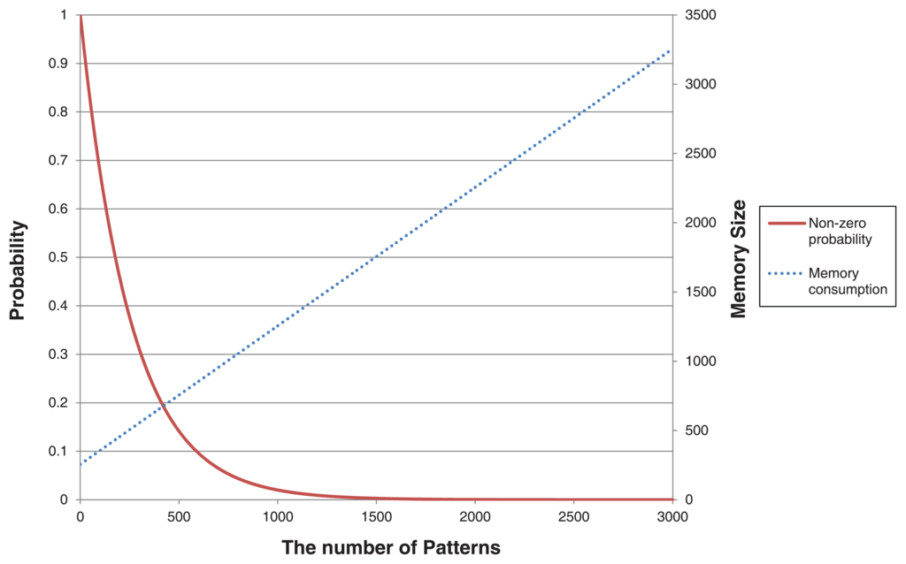 Using a simple probabilistic approach, we evaluate the performance of MinWM. Setting Σ to be the number of alphabets, a matching probability of only one pattern that equals the probability of zero shifting is simply derived as (1/ΣB). In addition, no pattern is matched with a substring of the text if actual shifting would occur. From the derivation, the non-zero shifting probability equals (1 − 1/ΣB)∊. This equation shows that the performance is strongly related to the number of patterns to be detected. Figure 7 reveals the relationship between the signature size and the non-zero probability. In the proposed approach, each signature only requires one additional byte in the prefix table. Although the memory is sufficient to contain all signatures in Snort, the general WM algorithm restricts the appropriate number of patterns. Only 500 signatures drop the non-zero probability below 20% and definitely decrease the throughput of the algorithm. However, MinWM is still considered a reasonable method because the DoS attack signatures are limited in number and overlap with each other. Moreover, the problems of detecting a large number of patterns are solved by the distributed processing of multiple sensor nodes.