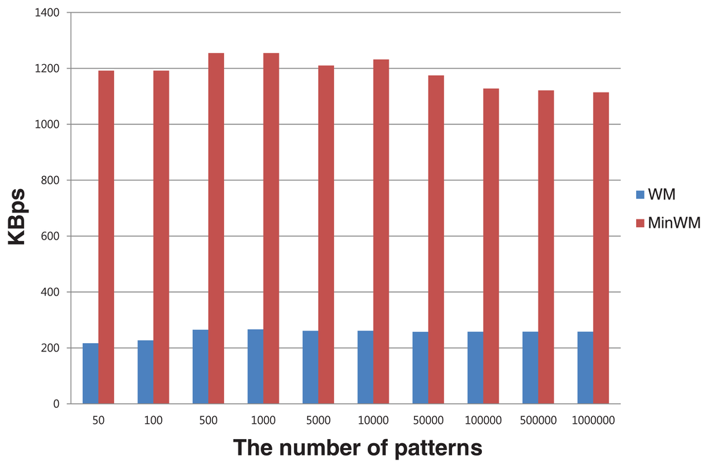Figure 8 shows the average throughput of the two pattern sets. In MinWM, the suffix and prefix matching steps are skipped by the bookmarks. MinWM only performs the entire pattern comparison using the pre-written bookmarks. By comparing the results, MinWM shows faster detection time of suspicious strings than the general WM algorithm. The figure indicates that MinWM is on average 4.76 times faster. The faster detection helps the base station to gather sensing information more efficiently. The improved detecting performance also helps to manage more sensor nodes. Considering that many sensor nodes are typically utilized for large-scale sensing activities, higher density sensing environments can possibly be provided by the increased capacity.