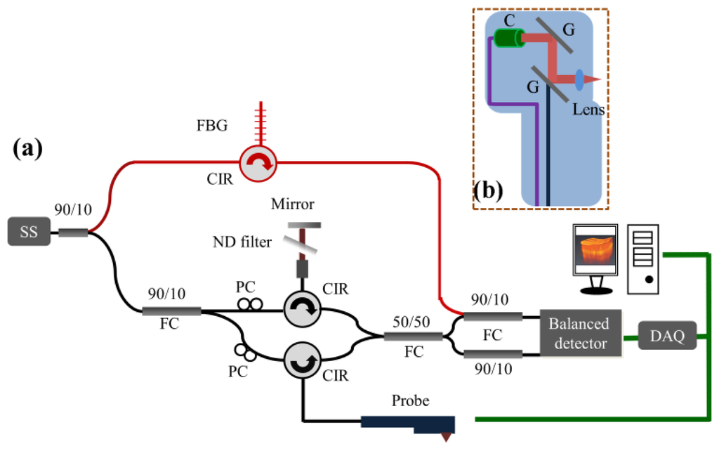 Figure 1. (a) Schematic diagram of the portable SS-OCT system used for studying water diffusion in the skin. (b) Layout of the handheld probe. PC: polarization controller, CIR: optical circulator, FBG: fiber Bragg grating, FC: fiber coupler, DAQ: data acquisition board, C: collimator, and G: galvanometer.
