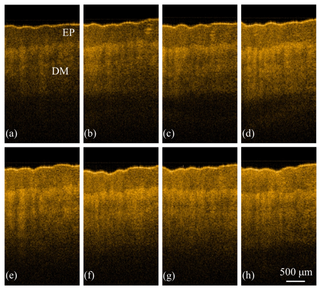 Figure 2. In vivo OCT scanning results of the left index finger obtained at 0 (a); 3 (b); 6 (c); 9 (d); 12 (e); 15 (f); 18 (g); and 30 min (h) after soaking the left palm in water. Each OCT image consists of 600 A-scans.