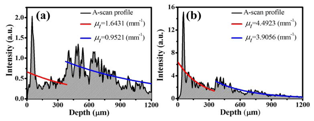 To evaluate the attenuation coefficient, we averaged the 11 adjacent A-scan profiles in this study, which correspond to 33 μm in the lateral distance. Figure 3(a,b) shows the A-scan profiles of Figure 2(a) and 2(h), which were acquired by averaging the 295th to the 305th A-scan profiles of Figure 2(a) and 2(h), respectively.
