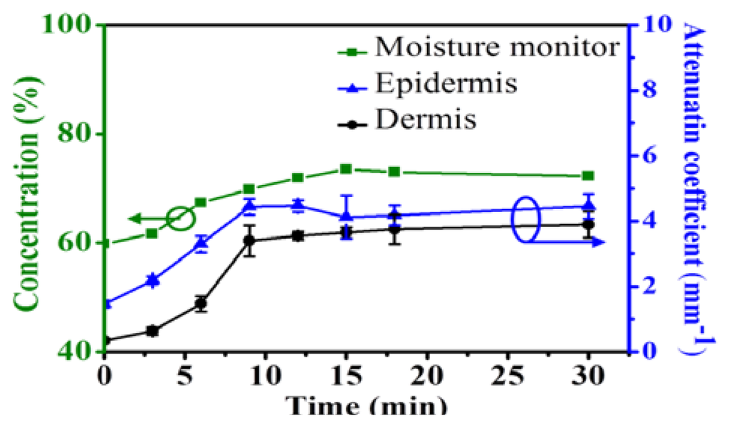 To statistically analyze the relationship between the moisture and the attenuation coefficient, the attenuation coefficients of the EP and DM layers of Figure 2(a–h) were evaluated and are shown in Figure 4, which also displays the measured results from the commercial moisture monitor as a green line. In Figure 4, the averaged attenuation coefficients with standard deviations are obtained over seven measurements. From the results, the evaluated attenuation coefficients based on the OCT data and the measured results from the commercial moisture monitor show the same trend as a function of time. However, only the moisture of the SC layer can be measured by the commercial moisture monitor. Compared with the commercial product, OCT can evaluate the attenuation coefficients of the EP and DM layers, which are moisture-related. From the evaluated μt values, the water concentration becomes saturated in the EP and DM layers after soaking the palm in water for 18 min, a result mirrored by the moisture monitor data.