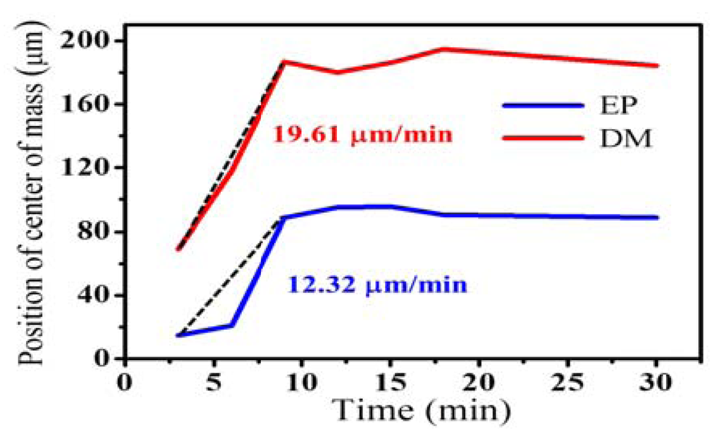 where Ij(z) is the intensity profile of the jth A-scan as a function of depth, z, in the intensity variance image. n represents the selected adjacent A-scan number for obtaining a averaged CM value, and m is the selected pixels in the depth range of the EP or DM layer for the evaluation of the CM value, corresponding to zm to be the total selected range. In this study, the selected depth ranges of EP and DM layers are chosen to be 300 μm starting from the skin surface and 500 μm starting from EP/DM boundary, respectively. Furthermore, n is equal to 11, corresponding to an averaged transverse range of 33 μm. Then, the CM values estimated from Figure 2 are shown in Figure 5. In Figure 5, the red and blue lines represent the CM values as a function of time, respectively. From the results, the CM values increase obviously before the 9th minutes and become slightly changed during the 9th to 18th minutes. After soaking the hand in water for 18 minutes, the CM values become approximately constant, referring to the saturation of water concentration in the skin. Furthermore, according to the movement of CM position, the diffusion velocities of the EP and DM layers can be obtained to be 12.32 μm/min and 19.61 μm/min, as shown in Figure 5. Such indicator can be useful to evaluate the skin conditions in clinical.