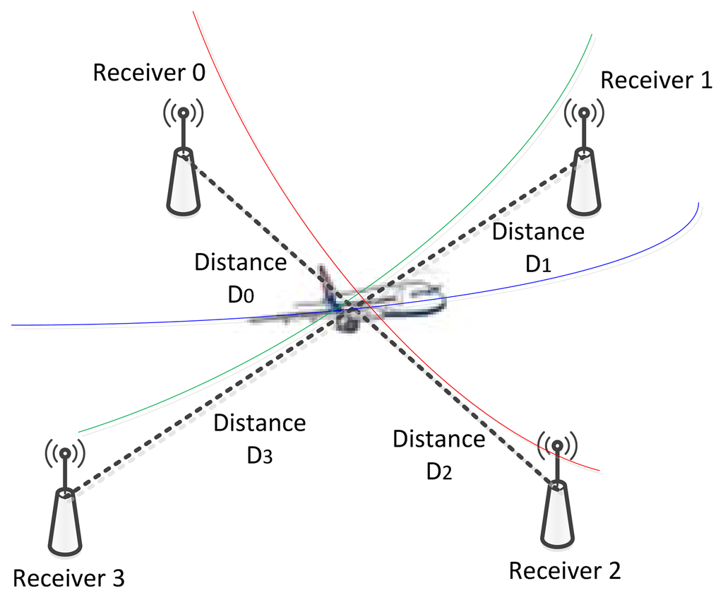 The basic principle of MLAT is the use of a hyperbolic curve and determination of hyperbolic position. These measurements use the time difference of arrival (TDOA) [19] of the received signal from four receivers. One of the receivers is used as a reference, and the remaining three calculate the position of the aircraft. The specific methods for TDOA are as follows [20,21]. The distance between each receiver and the target aircraft is calculated as follows: