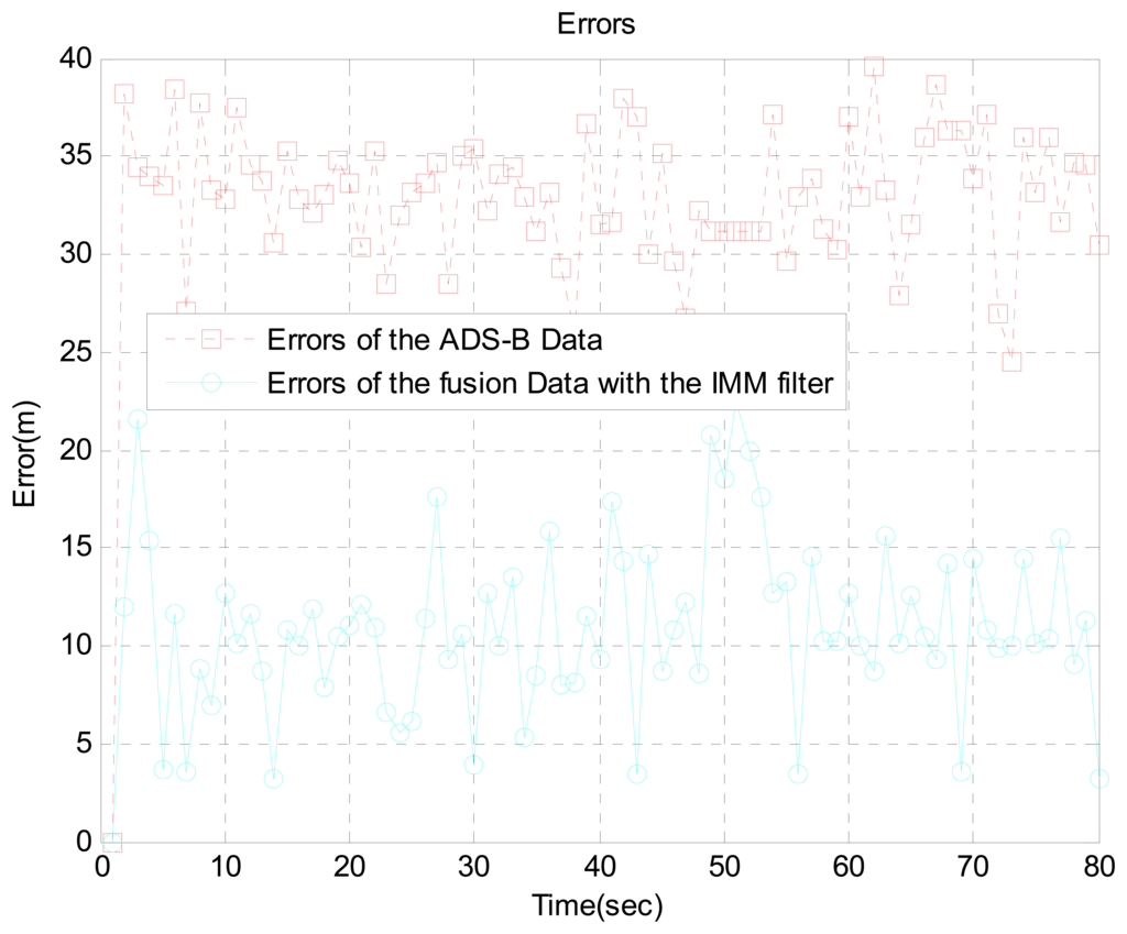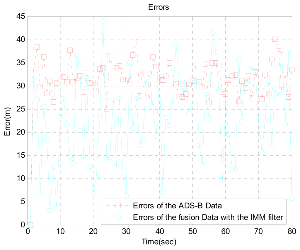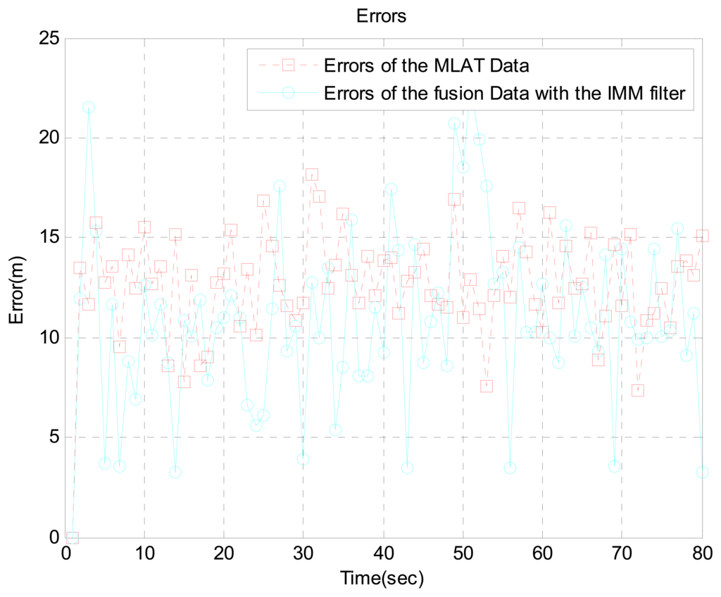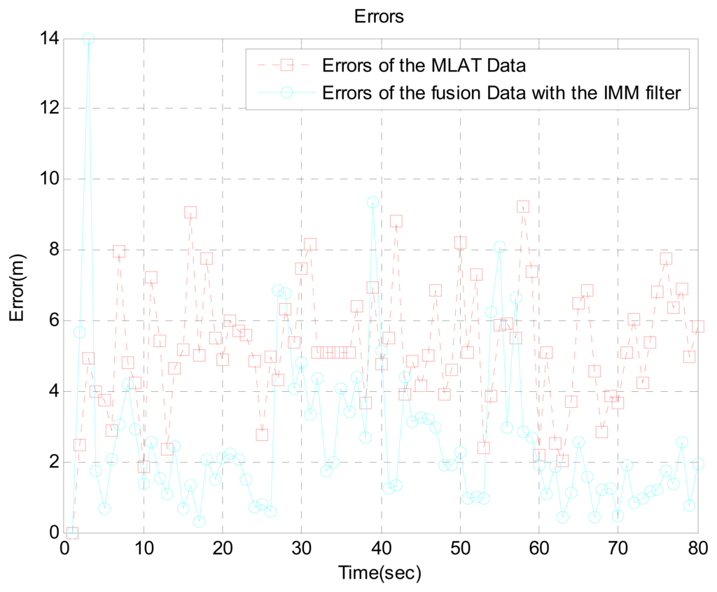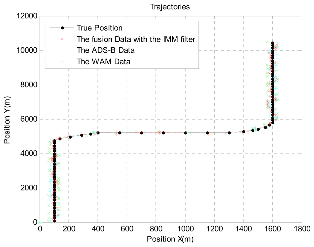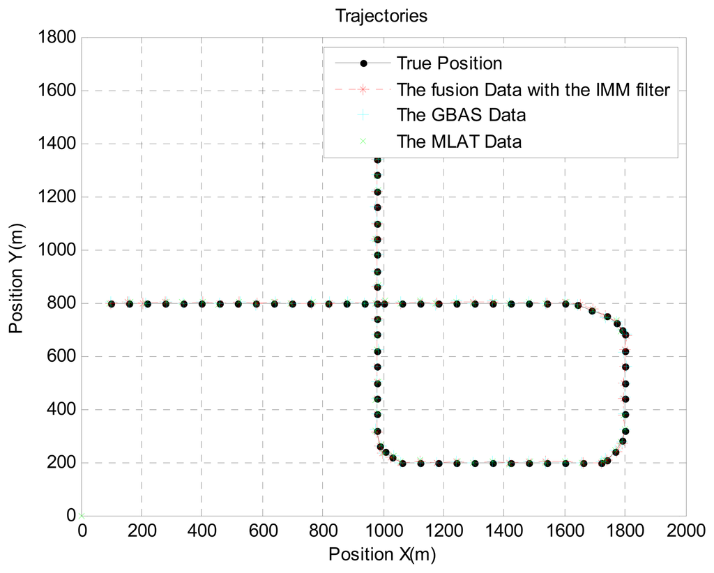 The Ground-Based Augmentation System (GBAS) is designed to enhance the Global Navigation Satellite System (GNSS) to meet the requirements of CNS/ATM. GBAS provides advanced approach, landing and departure services [2]. In Automatic Dependent Surveillance-Broadcast (ADS-B), aircraft broadcast their location and other details such as climbing speed to adjacent aircraft or ground stations for accurate surveillance [3]. Multilateration (MLAT) is employed when the installation and operation of radar is difficult or there is an aircraft surveillance dead zone. MLAT is very useful when such dead zones exist, or when the cost of installing additional radar facilities is prohibitively high because of the structural propagation characteristics of current radar through the airport and major airways. It also can be useful in aircraft detection below a certain altitude and screen jamming due to mountains and obstacles [4]. The basic concept of wide-area multilateration (WAM) is the same as that of MLAT, but it can monitor areas far from the airport. In other words, MLAT monitors aircraft and moving objects in close range such as the airport grounds, and WAM is a system that monitors aircraft on major airways [5]. GBAS, ADS-B, MLAT, and WAM are all next-generation technologies with higher accuracy than existing technologies. However, this paper proposes the use of sensor fusion method with Interacting Multiple Model (IMM) filter for greater reliability.