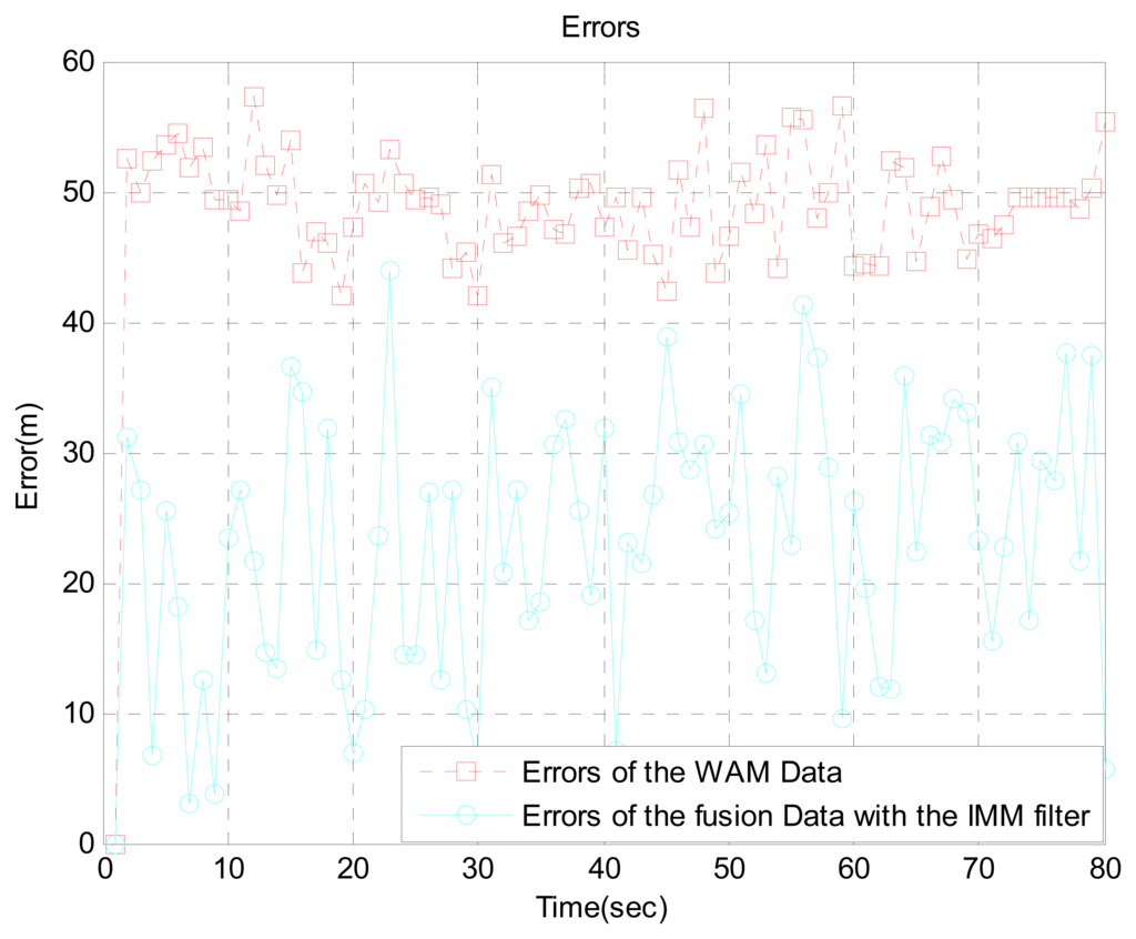 Likewise, Figure 12 shows the error between the WAM data and sensor fusion data. As seen in the figures, the sensor fusion data has less error than the original ADS-B data and WAM data.