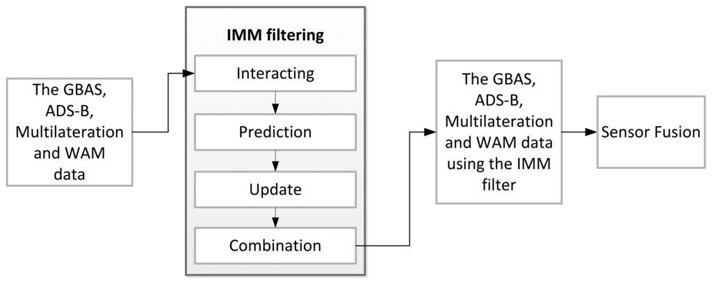 In order to fuse GBAS, ADS-B, MLAT and WAM, the sensor fusion method with the IMM filter is proposed. Assume that we obtain measurements from N sensors and the covariance and estimates for these N data are obtained with the IMM filter. The calculated estimates and covariances are sent to the main filter, which provides a final result.