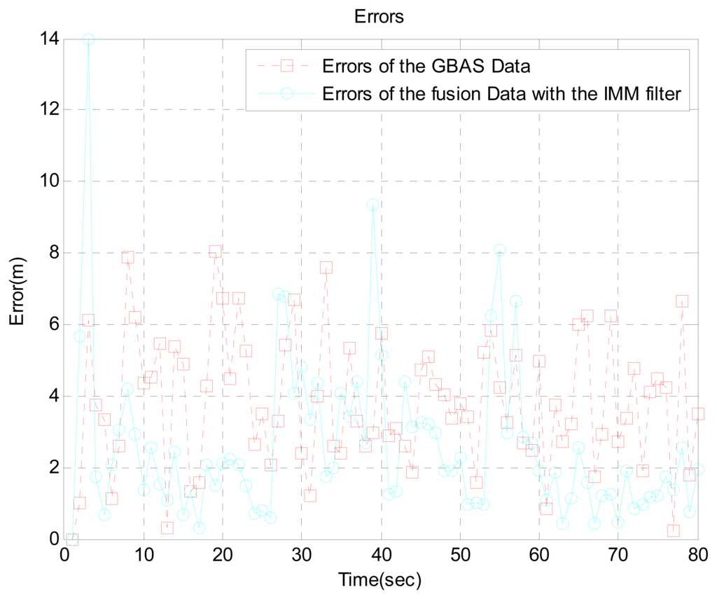 In scenario 1, the target is near an airport. Because the speed is relatively low and there are many acceleration and turning movements, we generated the aircraft trajectory shown in Figure 4, which shows the aircraft's true position, GBAS data, MLAT data, and the sensor fusion data with the IMM filter. For a more realistic simulation, we added MLAT failure and MLAT signal loss using the Poisson process. Error usually increases near airports because of multipath interference. Therefore, we increased the error by 5 percent. Figure 5 shows the error between the GBAS data and the sensor fusion data with the IMM filter. Likewise, Figure 6 shows the error between the MLAT data and the sensor fusion data with the IMM filter. As shown in the figure, the sensor fusion data with the IMM filter has less error than the original GBAS and MLAT data.