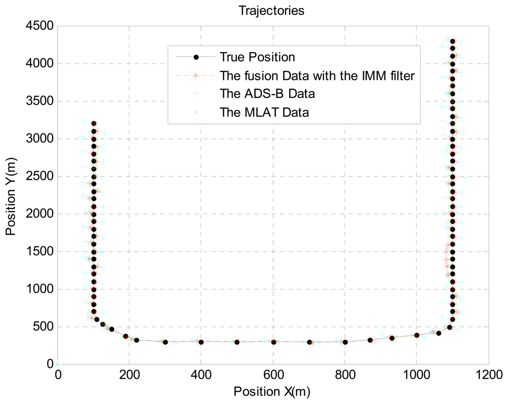 We used virtual sensor data. In addition, we set up and simulated three scenarios with targets at different distances from the airport, as shown in Table 1. We believe the proposed scenarios in this paper are perfectly practical and appropriate for air traffic control. First of all, there has not been any practical set of scenarios regarding aircraft movements reported in literature, at least to the very best of our knowledge. The presented scenarios (1, 2, and 3) reflect the fact that aircrafts near an airport undergo three motions—uniform motion, accelerated motion, and rotational motion—and that those away from the airport only undergo uniform motion. Also considering how GBAS and MLAT sensor can only be used near an airport, the proposed scenarios seem perfectly practical.