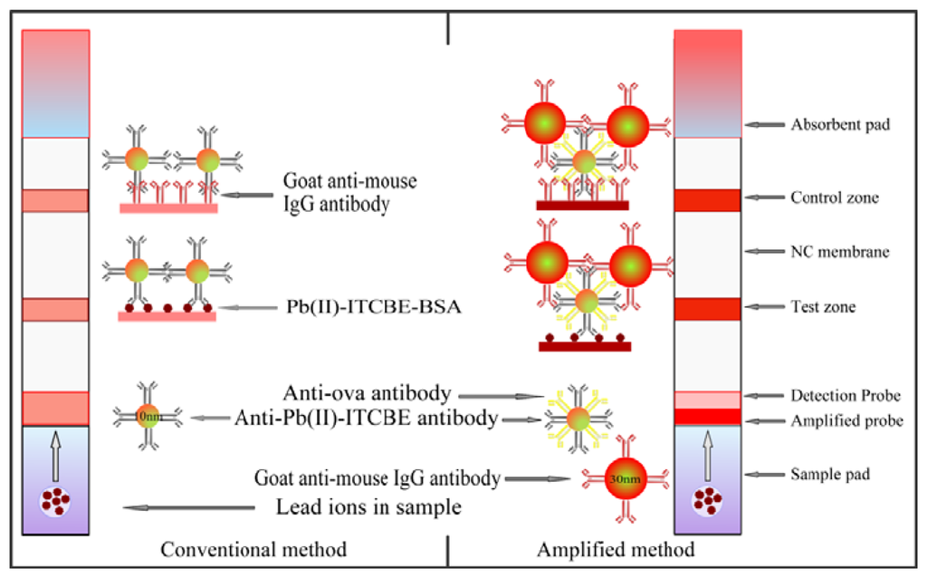 ELISA has been developed as an effective alternative tool for the detection of some metal ions by many groups [11–14]. Zhou et al.[13] have demonstrated an improved method using gold nanoparticles as an amplified probe to detect Hg(II), Pb(II), and Cd(II) based on the traditional ELISA system. The detection process was still time consuming and involved multiple incubation and wash steps so this method could not satisfy the requirements for rapid and on-site detection. Recently, the lateral flow assay (LFA) has emerged as a powerful analysis platform for detecting various analytes including small molecules, such as pesticides, biotoxins and heavy metals, due to its speed, simplicity and low-cost characteristics [15–18]. However, a common problem is that the sensitivity of the conventional LFA is lower than that of the ELISA. Tang et al.[16] have used nanometer-sized TiO2 to enrich the lead ions in water samples before using a strip test. The sensitivity of this conventional LFA was low, which could not satisfy the detection requirements. While some enhanced methods have been applied to improve the sensitivity of the LFA, most of them were based on sandwich assays to detect large biological molecules [19], rather than on competitive assays to detect small molecules. In this report, we first introduce a heterogeneously-sized gold amplified probe to construct a strip immunosensor for detecting lead ions in drinking water samples. Compared with the conventional method, this amplified method has typically increased sensitivity by 4-fold with a visual limit of detection (LOD) of 2 ng/mL. This antibody-based sensor suffered from no interference from other metal ions. The detection process was simple and could be accomplished within 15 min without any enrichment process. This method could be used as a potential tool for preliminary monitoring of lead contamination in drinking water.