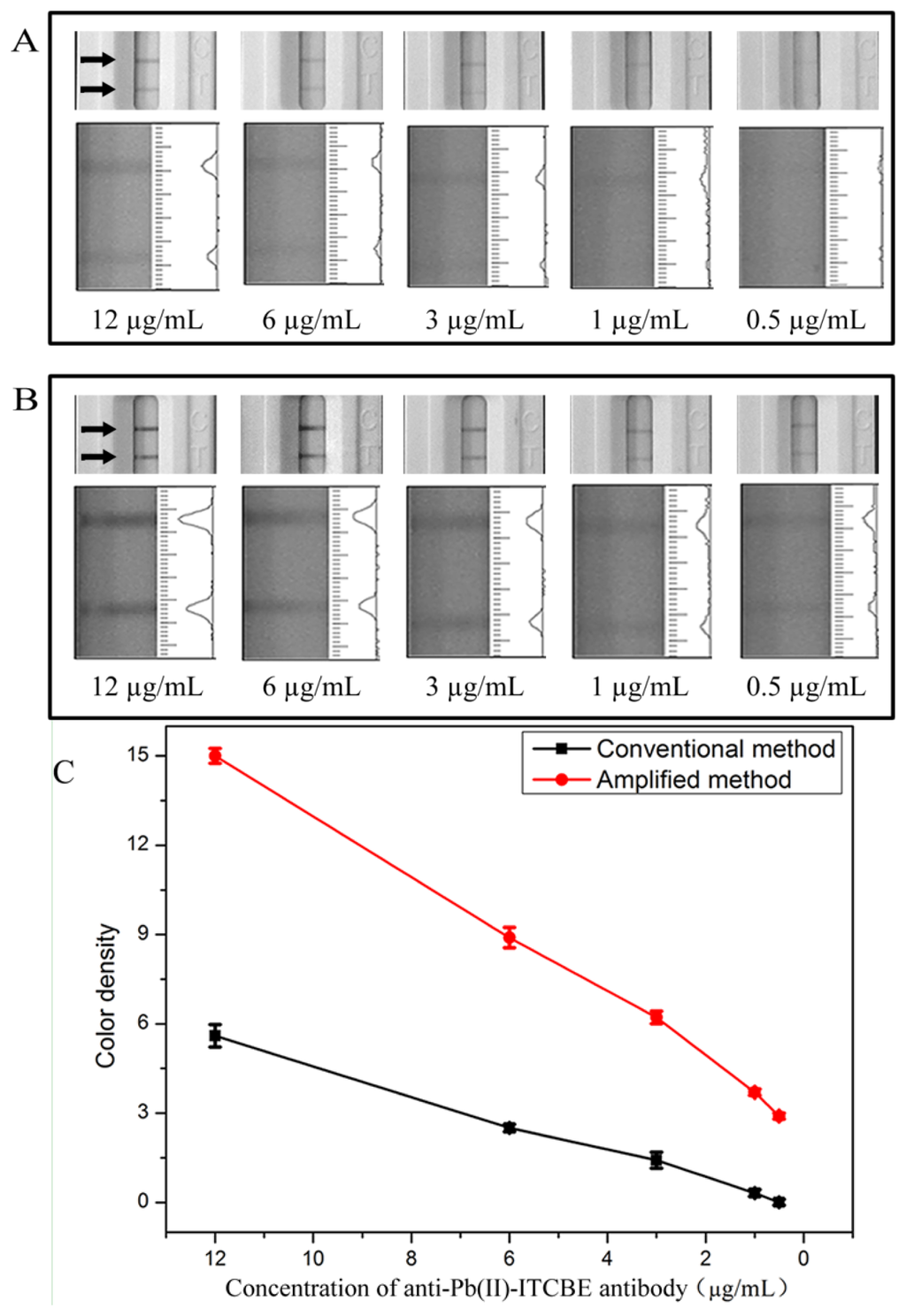 When 0.5 μg/mL of anti-Pb(II)-ITCBE antibody was used, no color was observed on the test zone in the conventional method and through amplification the color intensity on the test zone appeared. However, the line under these conditions was too faint for use as a negative control. In order to make the color intensities remarkable and comparable with that of the conventional method, an anti-Pb(II)-ITCBE antibody concentration of 3 μg/mL was used. The anti-OVA antibody of 10 μg/mL was used and this concentration was in excess. As shown in Figure 3, under these conditions, the color intensity of the negative results of the two methods were almost the same and the sensitivity was improved.
