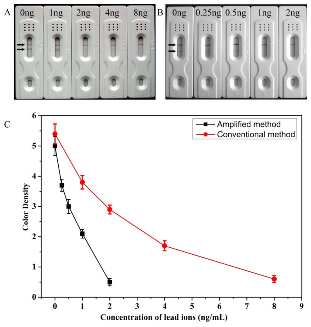 The strip sensor was applied to the detection of different concentrations of lead ions. Briefly, 50 μL of lead standard solution (0, 0.25, 0.5, 1, 2, 4 and 8 ng/mL) was added to 50 μL 2 mM ITCBE in 2× HBS buffer solution (20 mM sodium Hepes, 6 mM KCl, 274 mM NaCl, pH 7.4) and incubated at 37 °C for 0.5 h after a few minutes stir. Then 100 μL of mixture solution was pipetted into the sample port of the strip. The standard solution with different concentrations of lead ions was tested by the conventional and amplified method separately. The results were determined on the basis of presence/absence of the test line after 10 min. The color intensity of the test zone on the strip paper was recorded by the BioDot TSR3000 Membrane Strip reader at the same time (Gene Company Limited, Shanghai Branch, Shanghai, China). To evaluate the specificity of this method, metal ions including Hg(II), Cd(II), Cu(II), Cr(III), Mn(II), Co(II), Fe(II), Zn(II), Al(III), Mg(II), and Ca(II) were tested for cross-reactivity at the concentration of 1000 ng/mL.