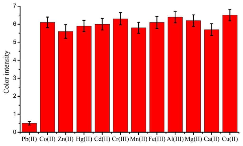 Although various new detection techniques have been developed through colorimetry, fluorimetry, and voltammetry [3–8], currently common and reliable detection methods for lead ions in water, vegetables and many other food products mainly depend on laboratory instrument analysis including graphite furnace atomic absorption spectrometry (GFAAS), inductively coupled plasma atomic emission spectroscopy (ICP-AES) [9] and inductively coupled plasma mass spectrometry (ICP-MS) [10]. These methods are expensive, time-consuming, labour-intensive and require professional staff to perform the testing, so a simple, economical and general detection method for direct analysis of drinking water samples is imperative.