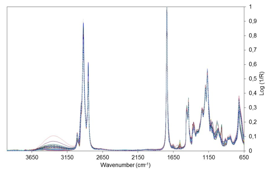 The infrared spectra were acquired on a Perkin Elmer model Spectrum 400 FTIR Spectrometer, based on a Universal Attenuated Total Reflectance sensor (UATR-FTIR). A range from 4,000 to 650 cm−1 was scanned, with a resolution of 4 cm−1 and 32 scans. The crystal utilized in this technique, contains diamond in its upper layer and a zinc selenide focusing element. The spectra of each sample were acquired with six replicates. Later, they were normalized, in order to eliminate the differences in intensity stemming from concentration variations, reducing external effects in the same order of magnitude, and all of them varying within an intensity range from 0 to 1 [30].