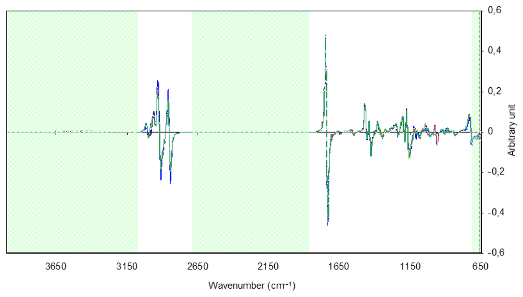 In the PCA and HCA, the 735–1,783 and 2,810–3,035 cm−1 regions were selected because the other regions contained no spectral information or were polluted by water vapor or carbon dioxide bands due to poor compensation. For obtaining the HCA dendrogram, the Euclidian distance and the incremental connection method were used. In Figure 2, one can observe the spectra of samples of biodiesel with the application of the first derivative and the SNV. The regions of the spectra that were excluded are highlighted.