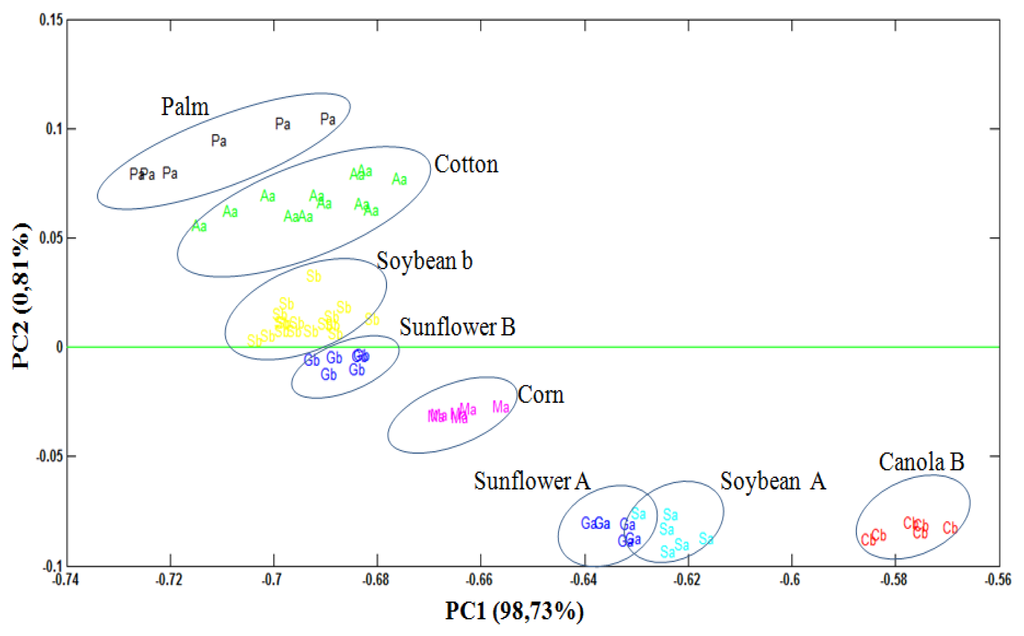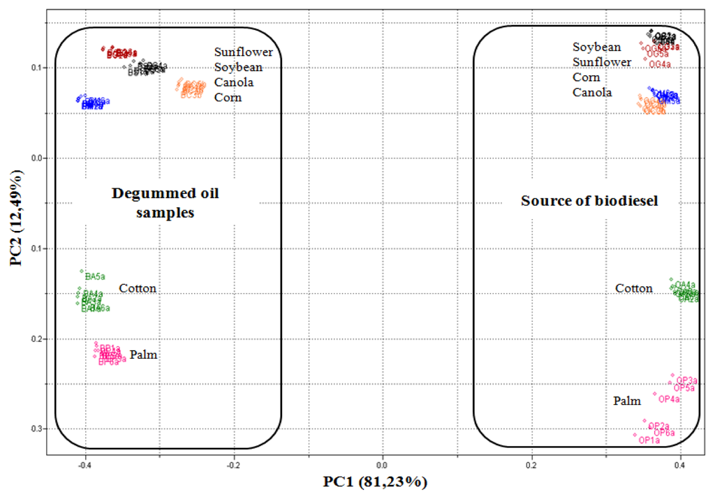 Through the PCA, it was observed that 93.73% of data variances were explained by the analysis of the two principal components. Figure 3 shows PCA scores plot (PC1 versus PC2) obtained from UATR/FTIR data. PC1 separates the biodiesel samples, with positive values, from the degummed oil samples, in negative values on the scores chart. On the other hand, PC2, in turn, manages to separate both the biodiesel samples and the samples of palm and cotton degummed oils, in positive values, from the samples of biodiesel and samples of soybean, sunflower, canola and corn degummed oils, in negative values on the scores chart.