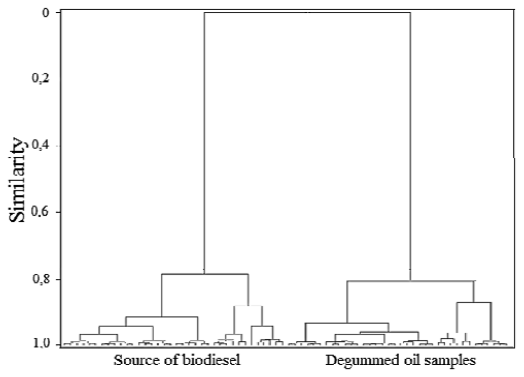 In this dendrogram one can observe the presence of two clusters, one associated with the biodiesel samples and the other associated with the degummed oil samples. The results achieved in the dendrogram are totally in line with the results achieved on the PCA scores plot (PC1 versus PC2).