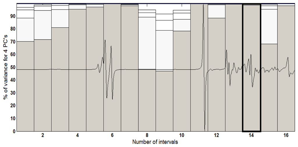 The best results at the iPCA were achieved with the two first principal components (PC1 versus PC2) and splitting the spectrum into 16 equidistant intervals. Figure 5 features the percentage variance chart for every region studied. In this chart, for each interval, that is to say, for each region of the spectrum, variance is calculated, in percentage terms, for each principal component. It should be added that the bars present in percentage form (height of the bars) the variance contained in each main component for each interval. In this figure, interval 14 accumulates 99.54% of information in the first two principal components for the UATR-FTIR spectra data.