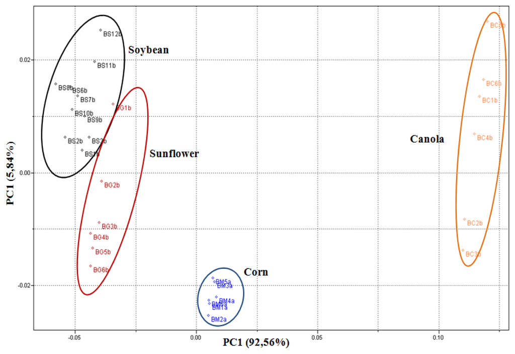 Were used six different vegetable oil sources: canola, cotton, corn, palm, sunflower and soybean. For the latter two, two samples of each oil from different sources were acquired. A two-letter code was used to identify the samples. The first letter specifies if the oil sample is degummed (O) or biodiesel (B), the second letter specifies which vegetable oil source was utilized (for example, C = Canola) and the code that comes next to letter identification represents the analysis reproduction number. Finally, the small letter (a or b) identifies the origin of the sample. The biodiesel samples were produced from samples of degummed oils. From the cotton oil sample two batches were produced and from the soybean sample (b) three batches of biodiesel were produced. This procedure was adopted with the purpose to guarantee the method reproducibility. The canola and sunflower biodiesel batches were acquired from the biodiesel pilot plant of the University of Santa Cruz do Sul—UNISC, in Rio Grande do Sul, Brazil.