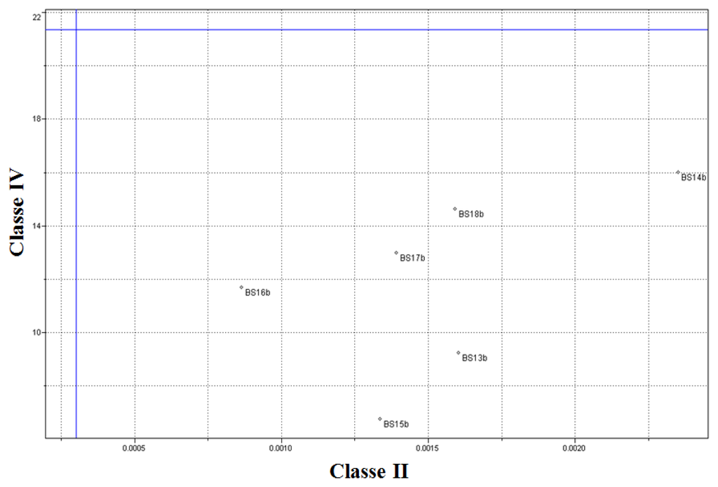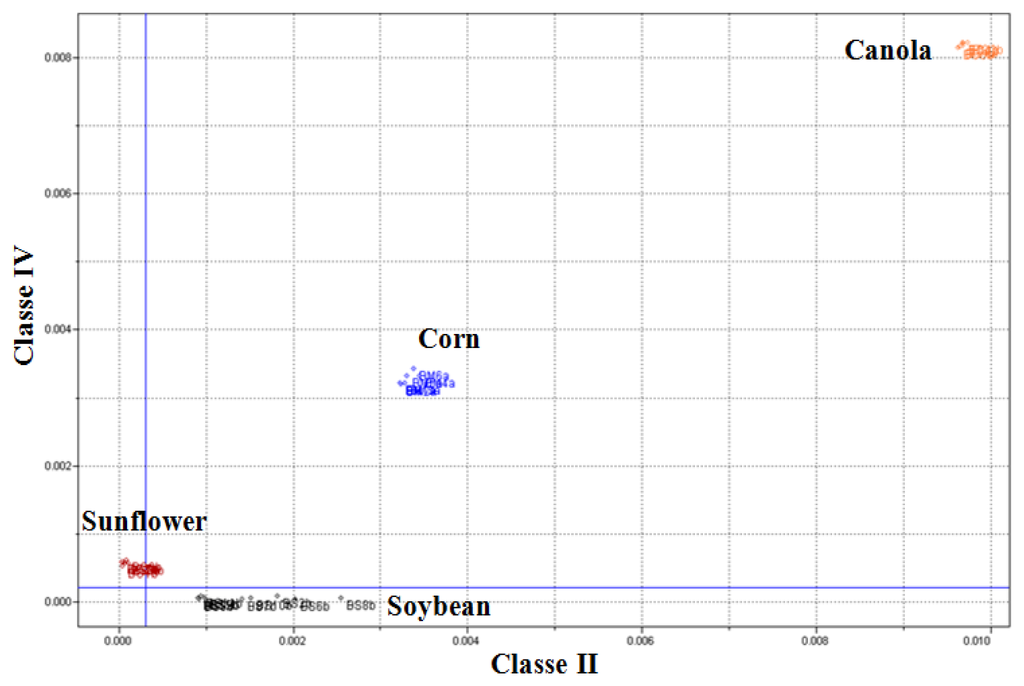 Table 3 presents a summary of the SIMCA model obtained. Figure 8 presents the Coomans diagram which features the orthogonal distances of the biodiesel utilized for the training set. It is observed that Class II and Class IV samples classify correctly into their respective classes.