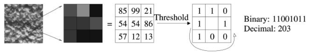 Local Binary Patterns (LBP) was introduced as a texture descriptor by Ojala [18]. It labels a point as the center point, and compute the differences between it and the points around. On occasion that the difference is larger than 0, we assign the result to be 1, or else to be 0. We give an example in Figure 1.