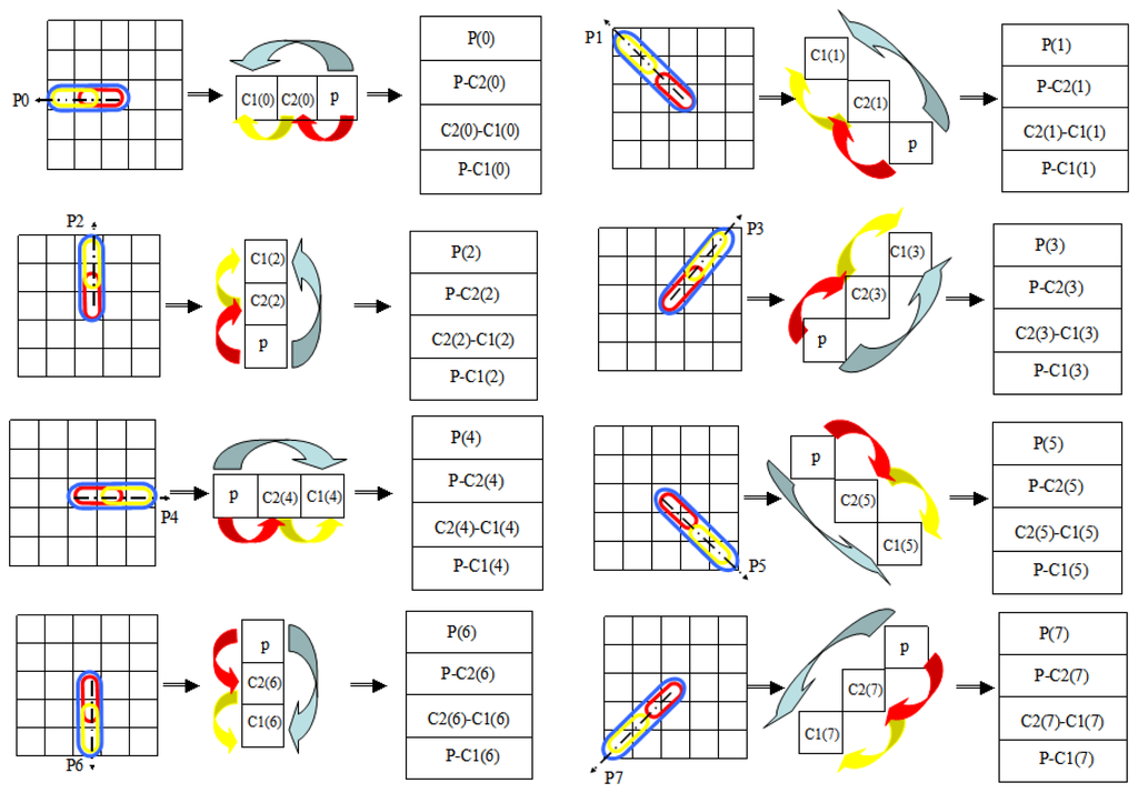 In Figure 4, there are eight iterations for a center point and each one takes three little blocks: (1) 5 × 5 box with three different ovals; (2) 1 × 3 rectangle lattices with three arrows; (3) 1 × 4 rectangle lattices. The oval region which covers three minimum square are extracted from the 5 × 5 double radii LBP model. The thick arrows indicate the operational relationship of squares in every oval region. Then we give the pixel value differences between the related squares in the 1 × 4 rectangle lattices.