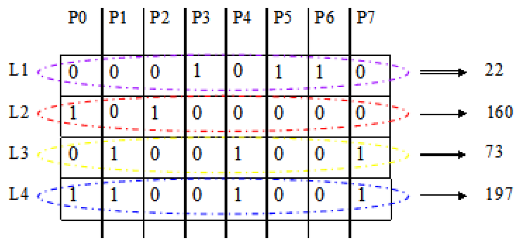 Here we list the encoded features in turn just like the way shown in Figure 5. The detailed result in Figure 5 is an example based on the model in Figure 3. For computational convenience, we transfer the eight binary codes at each layer into a decimal number. These four decimal numbers contain almost all the required information for a square.