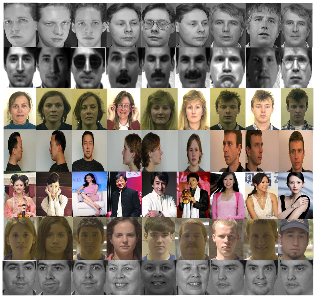 In the recognition module, we choose six well lnown databases and a self-made database to test our new feature. Each has its different emphasis, as shown in Figure 7. The ORL Database consists of 400 images of 40 different persons. The images mainly vary in pose and scale. The Yale Database contains 15 individuals with 11 images of each one. It emphasizes illumination and expression changes. There are 3,288 images corresponding to 116 people's faces in the AR Database which shows dramatic changes of lighting, expressions, poses and even accessories such as glasses and bangs. We also randomly choose three images of each person as training set and the rest as testing set. The ABERDEEN database includes 625 images of 65 persons. The images are strictly controlled in different lighting and expression conditions. The FRGC Database contains 12,776 images in the training set and 8,014 images in the testing set. This database is quite a challenge for its severe variation. The last database is FERET, which includes 1,400 cropped gray images of 200 persons. Angles and expressions are the focus. It should be noted that in our daily life, rather than the natural factors such as light or poses, makeup is the one that mostly distracting recognition problems. Noticing this fact, we downloaded images of film stars with different makeup from the internet and gather them together to form a database named FSTAR database. The FSTAR database contains 1,800 images of 120 persons. For each database, a random subset with three images per individual is used for training and the rest for testing. When the subset changed, we regard it as a new group of experiments. We performed thousands of groups of experiments with random subsets.
