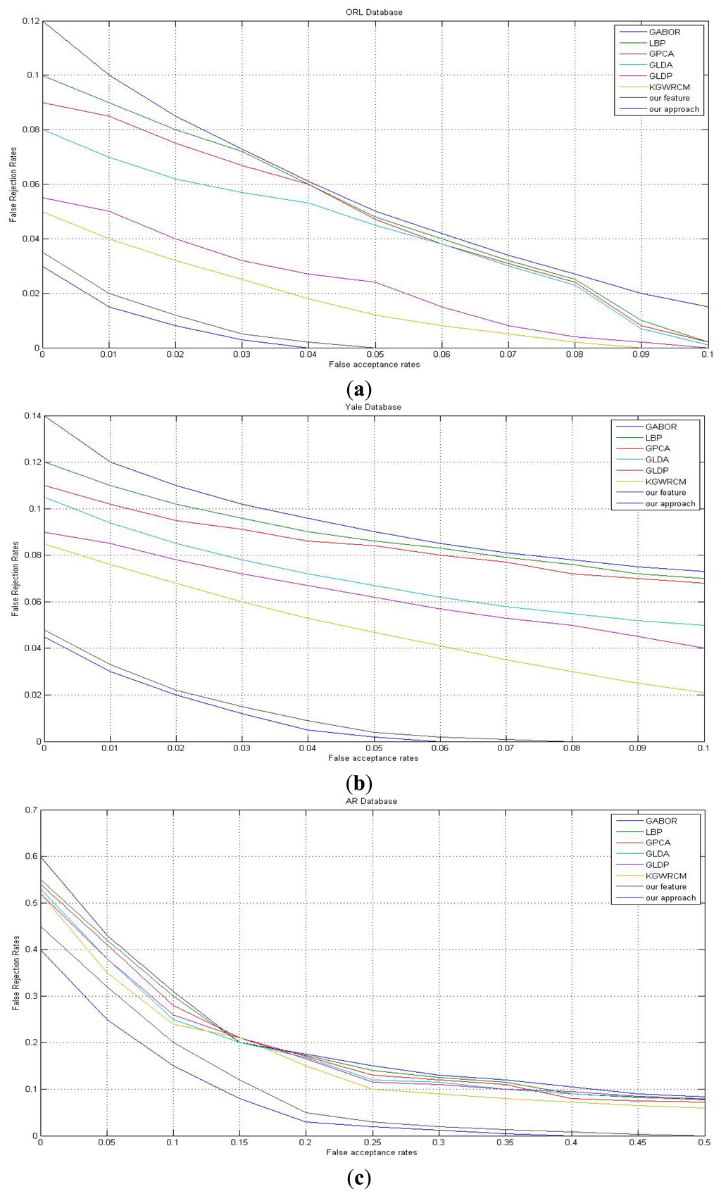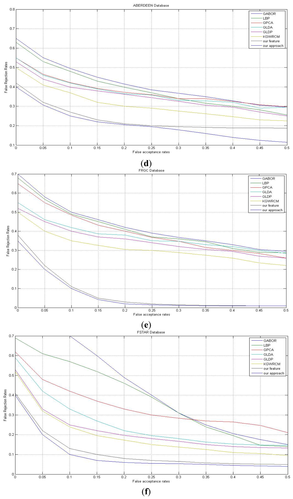 In general, ORL, YALE, AR are relatively simple, the recognition rates on it are high and the ROC curves are better than on FERC, FERET, FSTAR, ABERDEEN databases. It should be noted that the more difficult the databases, the greater the difference between our feature and other methods. This means our feature can bear changes more widely than other methods. The joint effort of static texture difference and dynamic contour consists of our high accuracy feature which extracts maximum intro-class similarity and inter-class otherness information.