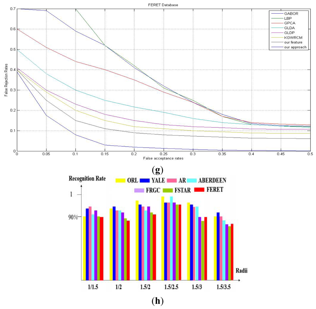 Besides, when testing with our methods, we sought to find how the local region size would impact the recognition rate, thus we conducted a new group of experiments by changing the radii of C1 and C2 each time and recording the result data. The result of this experiment is shown in Figure 8(h). We can see that the radius should be neither too big nor too small. It's the best choice when the two circles are just the adjacent layers around the center point. If the radii are both too small, the two circles are too near and the information is not representative, especially after subtraction. In contrast, if the local region is too sparse, the information of those pixels would have no rules or connections.