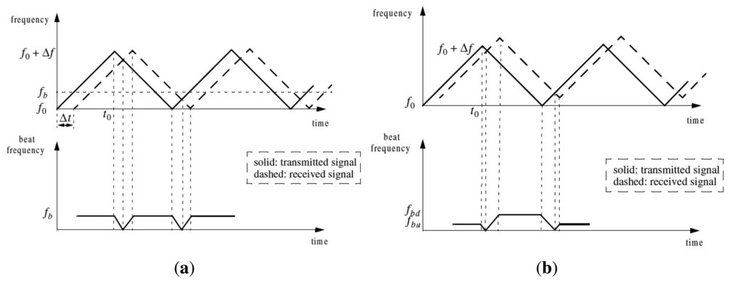 When the target is moving (see Figure 1(b)), considering the modulation slope, the shift introduced by the Doppler effect is added (negative slope) or subtracted (positive slope). Let us denote respectively fbu and fbd the beat frequencies of up and down modulation slopes: