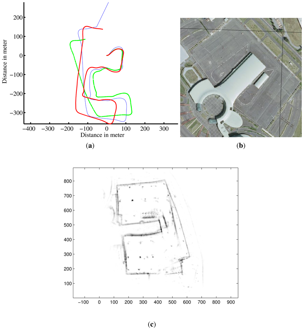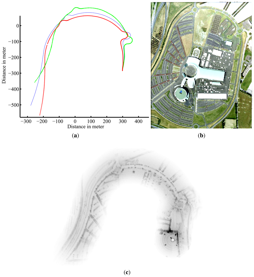 This section provides experimental results of the presented radar-based approach. The IMPALA radar sensor was mounted on a utility car, on top of the vehicle, 2 meters above the ground. The experimental runs that are presented were conducted in an outdoor field, near Clermont-Ferrand in FRANCE, on Blaise Pascal University campus and around the Auvergne Zenith car-park (cf. aerial view in Figures 10(b), 11(b) and 12), with a semistructured environment (buildings, trees, roads, road signs, etc.). Speed estimation has been done on different kinds of displacements, i.e., rectilinear displacement and also classical road traffic displacement with different curves.