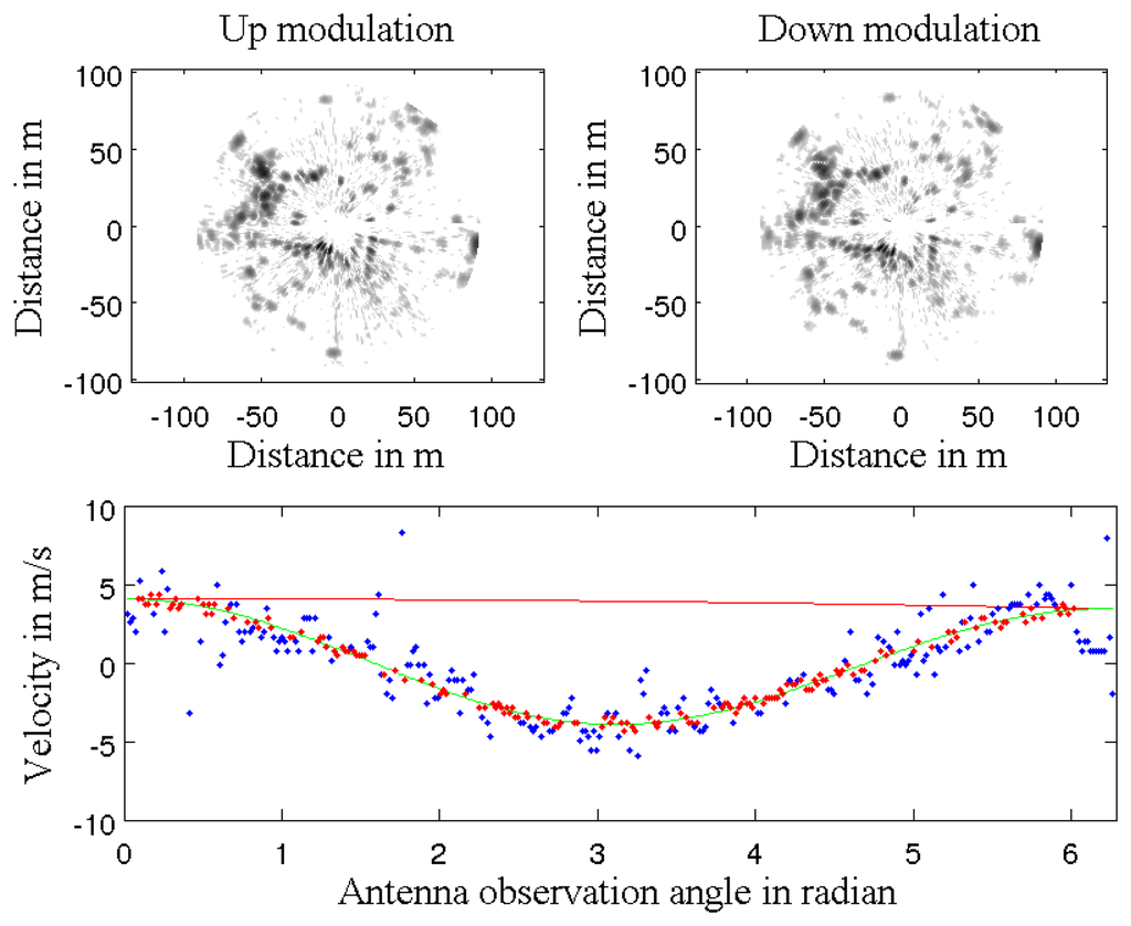 As a first step, the robot's own velocity has been estimated with different data sets acquired from the IMPALA radar sensor. The results of velocity profile extraction based on the method described in Section 3 are presented in Figure 13: on top, the two radar images obtained with the up and down modulation during a single antenna rotation. For each acquired radar beam, velocity is estimated (in blue dots) based on correlation techniques. The median least square method using covariance of the extracted Doppler is used to select inliers Doppler detection (in red dots) and to process the robot's velocity profile during the acquisition (in red line). The Doppler velocity profile is estimated in green line.