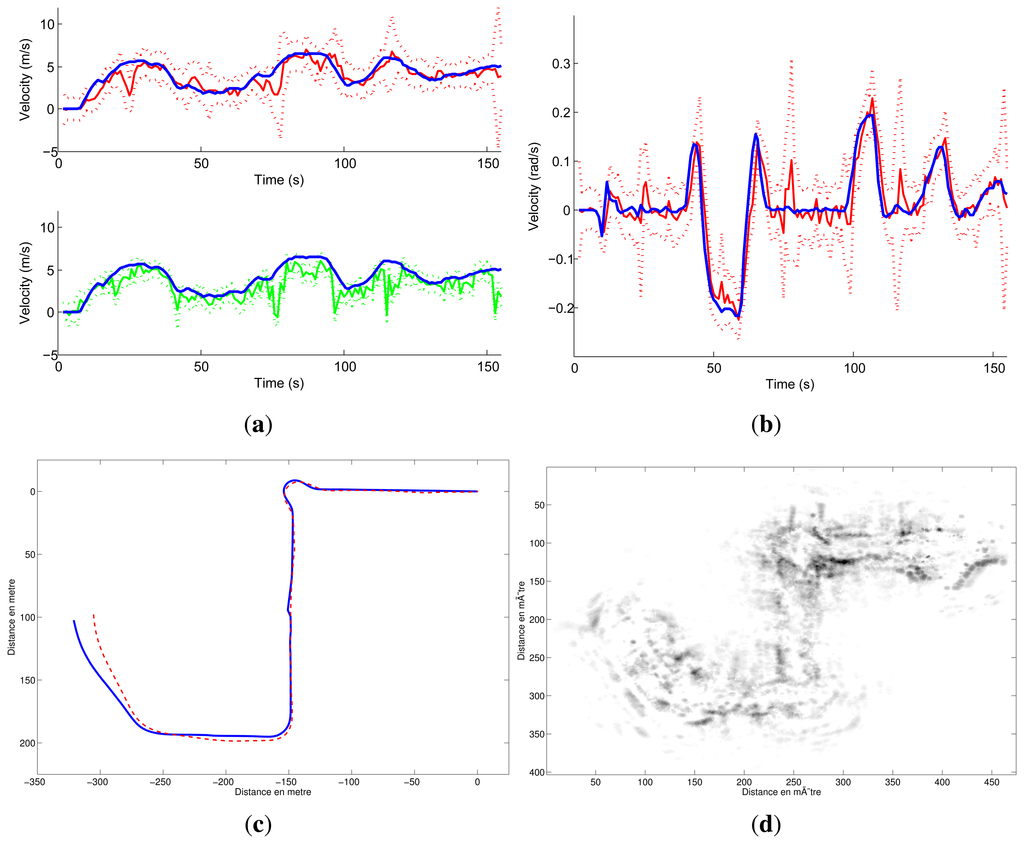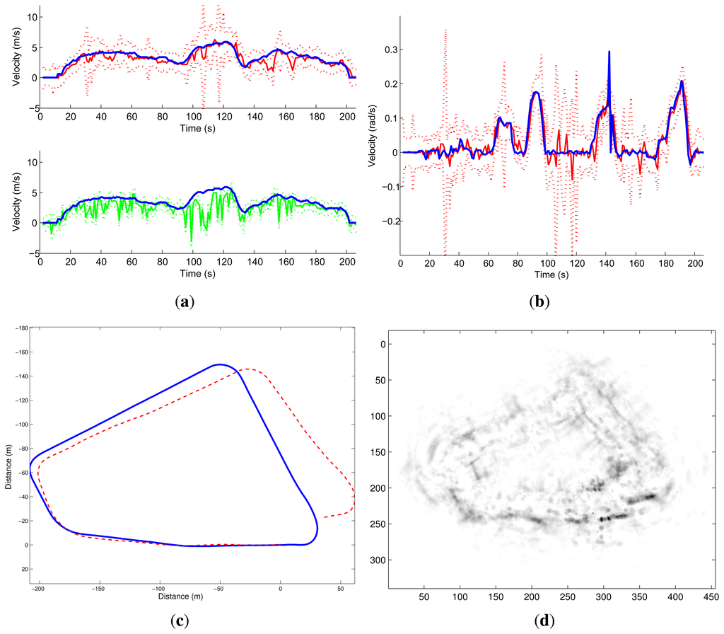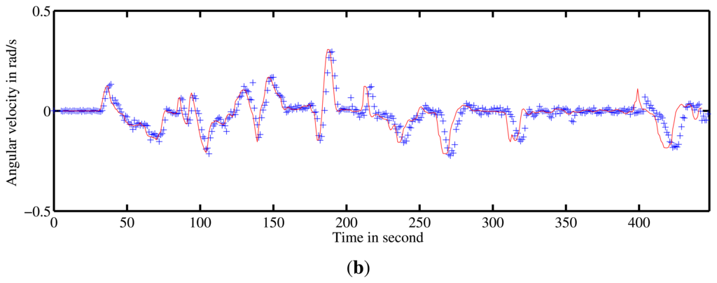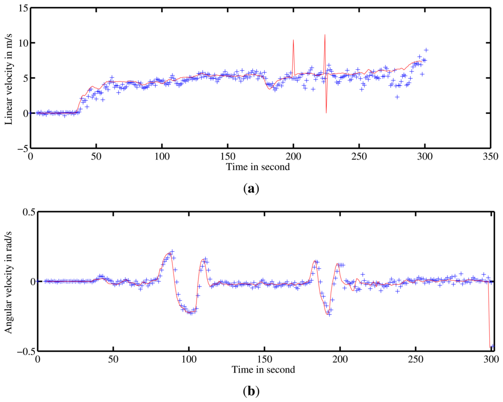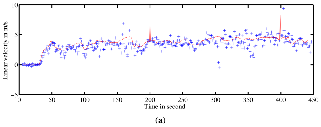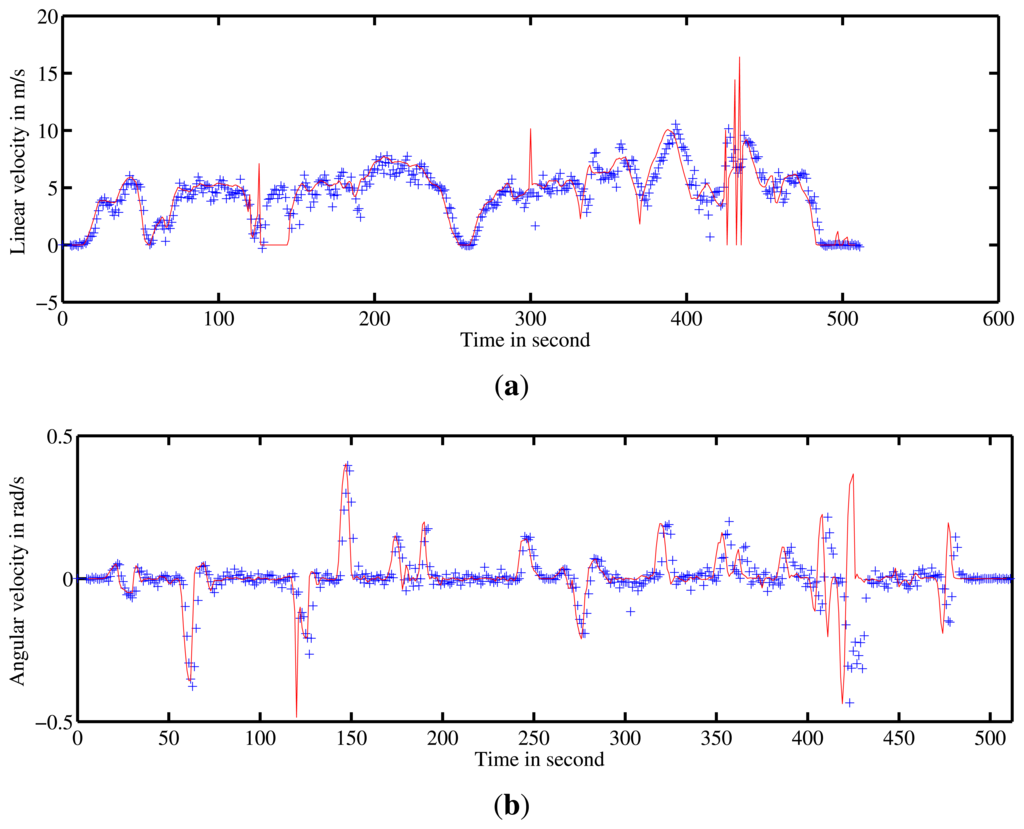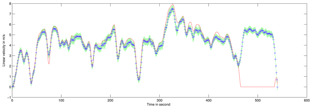 A first run was conducted on Blaise Pascal University campus. The utility car was driven over 2.5-km at a mean speed of 6 m/s. Angular and linear velocities were estimated during the entire trajectory. These estimates were compared with ground truth. The results of velocity estimation are presented in Figure 15.