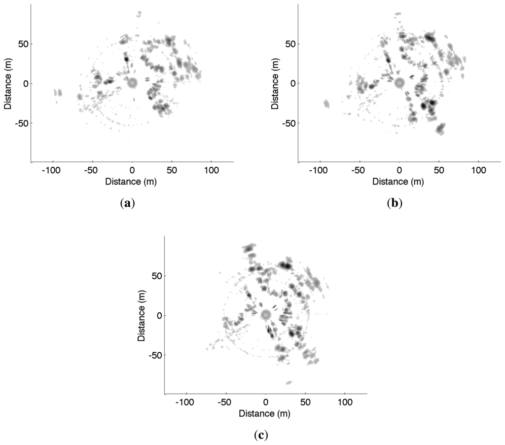 An example of three consecutive radar images acquired during these experiments is presented in Figure 19. Visual interpretation of the displacement between these radar scans is difficult, even for a human operator, whereas the proposed approach, coupling both Doppler analysis and distortion evaluation, gives promising results.