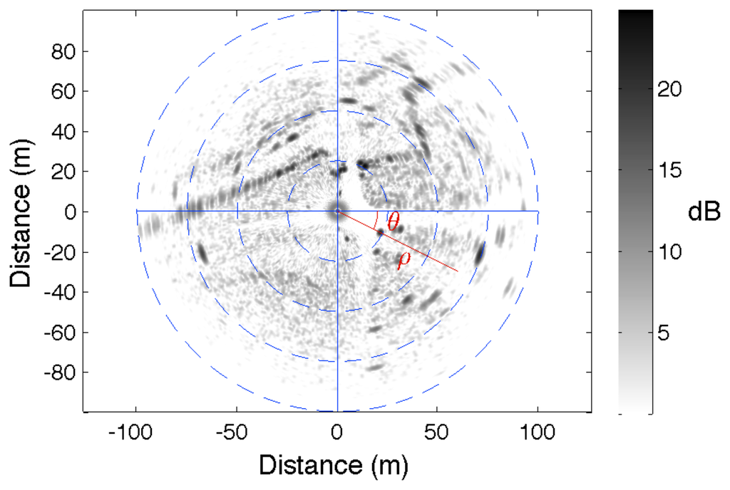 An example of radar image is presented in Figure 2. The radar is positioned at the center of the image. The gray scale level indicates the amplitude of the backscattered signal. Each element of the image is positioned through its polar coordinates (d, θ).