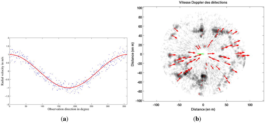 Median Least Square algorithm [23] is applied to estimate the parameters of X of the function V(t) based on Doppler estimates for each radar beam. This principle is illustrated in Figure 3(a). Each measurement of Doppler velocity VDoppler i has an uncertainty σDoppler. As a result, parameters of X of the function V(t) are estimated with their own uncertainty. Vehicle's own velocity profile V(t) and uncertainty σV(t) can be known during the radar acquisition.
